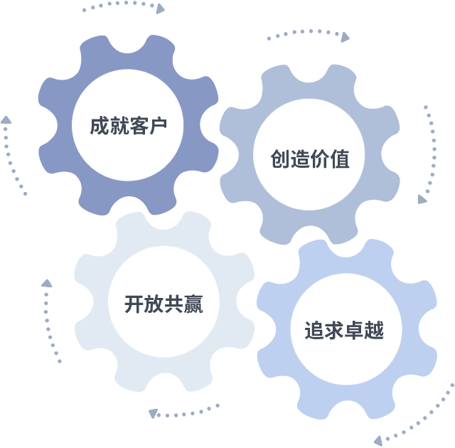 成就客户是一切决策的出发点,,创造价值是衡量所有工作的标准,,,,追求卓越是我们做事做人的态度,,,开放共赢是我们的格局也是最终的结果。。。价值观的齿轮环环相扣,,,,推动着组织里的每个人不断向前。。